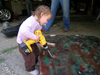| Who says power tools and toddlers don't mix? Eliana removing old holds so the panel can be painted. |